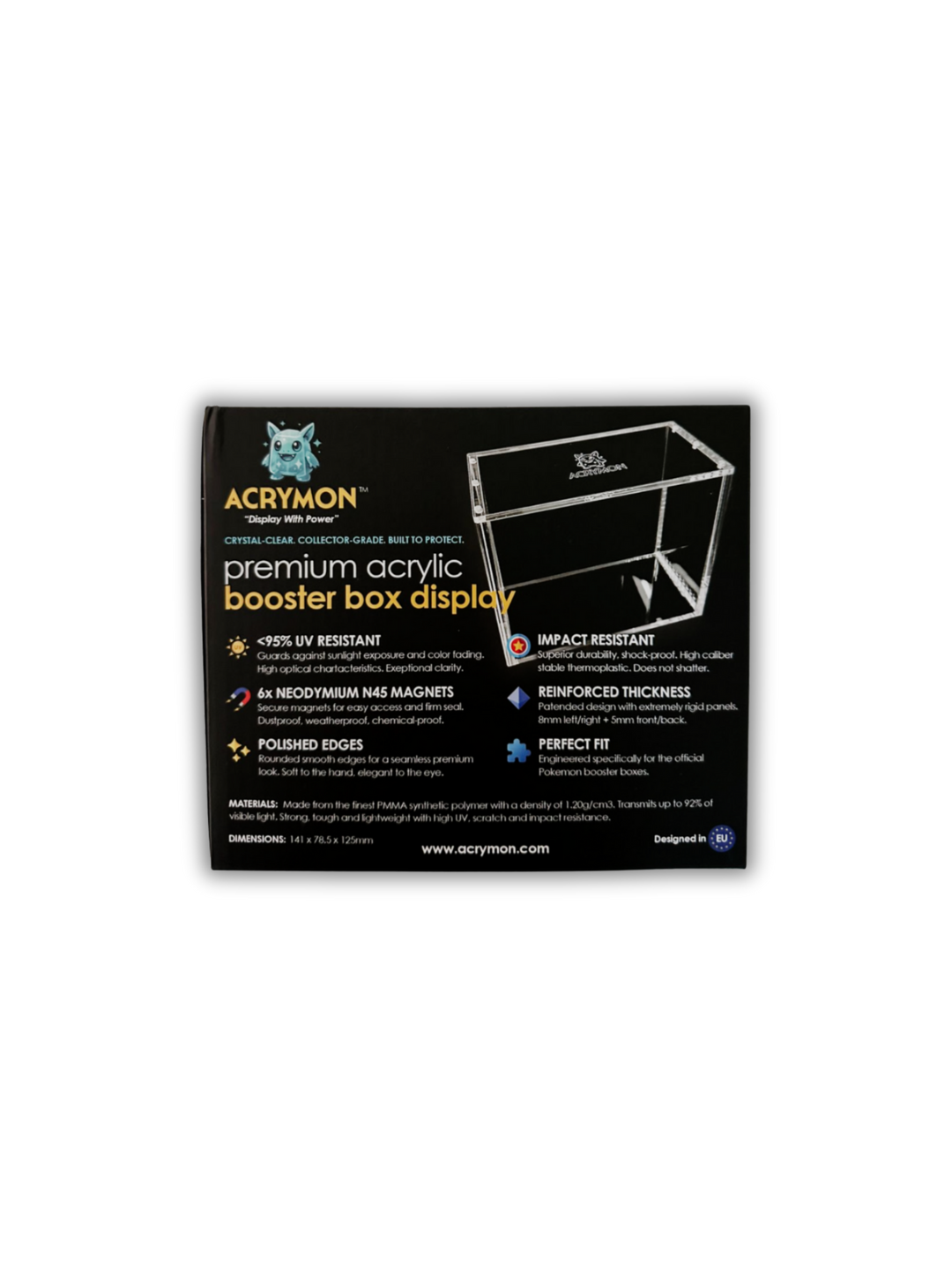 Features: 🛡️ <95% UV Resistant – Prevents fading from sunlight and harsh indoor lighting. 🧲 6x Neodymium N45 Magnets – Industrial-grade magnetic seal for a secure, airtight close. 💥 Impact Resistant – Shock-proof PMMA acrylic ensures long-lasting durability. 📐 Reinforced Thickness – 8mm (sides) + 5mm (front/back) panels for ultra-rigid strength. 💎 Crystal-Clear & Polished Edges – Sleek, seamless finish that elevates any display shelf. 🎯 Perfect Fit – Custom-engineered to house official Pokémon Elite Trainer Boxes.
